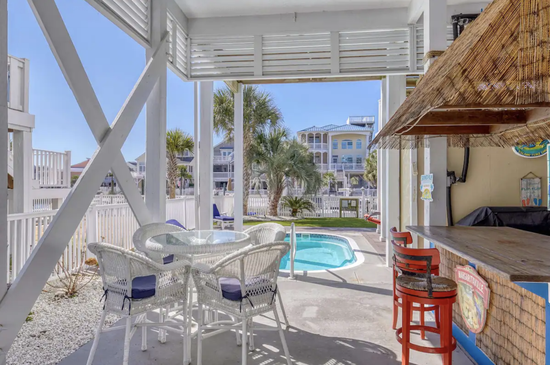 A magnificent canal front home on Ocean Isle Beach! Enjoy the dock for boating, fishing or crabbing. Have some fun in the pool and enjoy your favorite drink at the tiki bar. With extravagant vaulted ceilings, and an open concept living area. A slice of heaven with plenty of porch spaces to take in the view of the canal or ocean. Just a short walk to the public beach, and a golf cart or quick bike ride to the center of town, you’ll find restaurants, shops, mini-golf and ice cream!